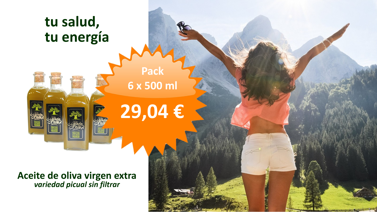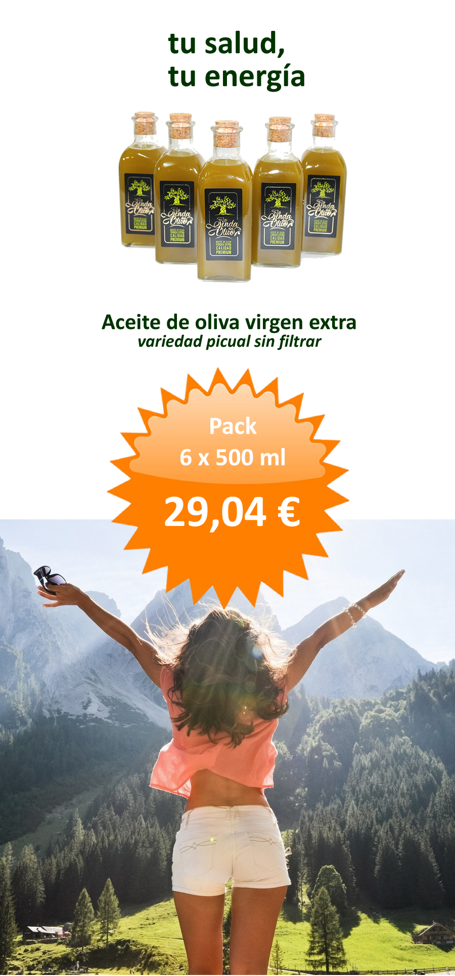 Aceite de Oliva Virgen Extra 100%. Inconfundible variedad picual con ese característico sabor intenso, ligero picor y amargor, de aroma afrutado, con tonos verdes y frescos que recuerdan a tomate, alloza, manzana, higuera y hierba recién cortada.